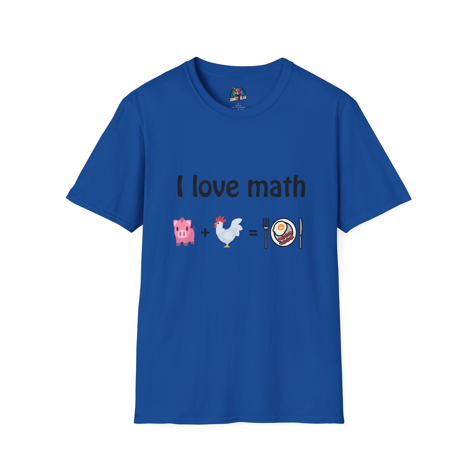 Math just got a whole lot tastier! Our "I Love Math" T-shirt is perfect for math lovers, foodies, and anyone who enjoys a little humor with their breakfast. Featuring a hilarious equation of Pig + Chicken = Eggs & Bacon, this design proves that some calculations are worth waking up for. This tee is sure to get laughs and maybe even a few hungry stares.